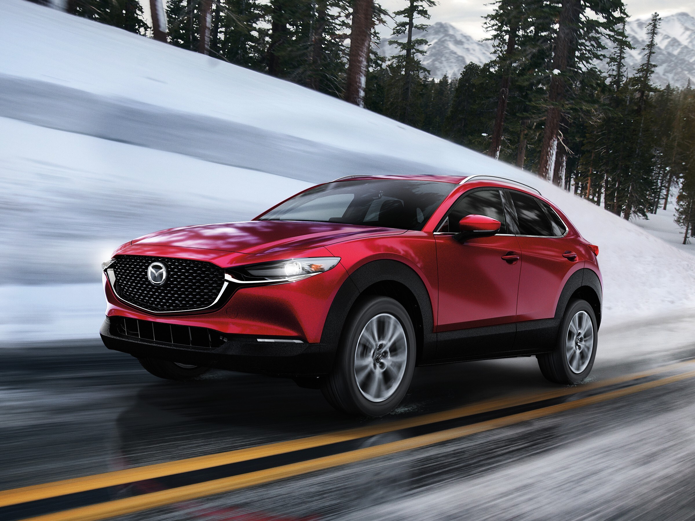 The Mazda CX-30 keeps a no-frills look with traditional character lines and colorways. LED headlights and daytime running lights keep the Mazda CX-30 will lit on the highway. Body-colored folding side mirrors, a roof-mounted shark fin antenna, power-sliding moonroof, and a rear power liftgate are a few of the available upgrades for the Mazda CX-30.